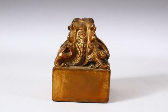 A CHINESE GILT BRONZE SEAL OF A DRAGON - inlaid with simulated coral and turquoise stones - the base with four character mark, 9cm