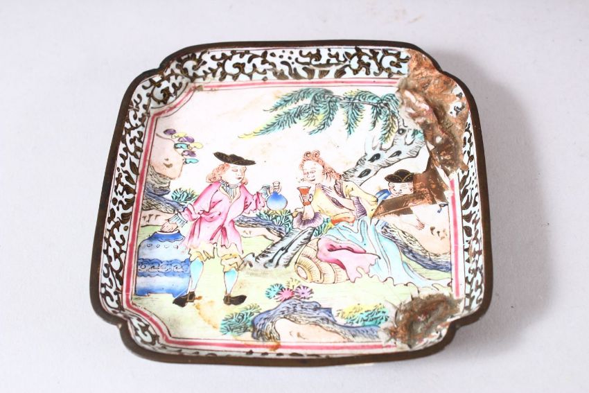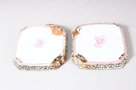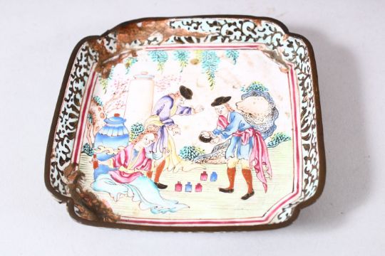 A PAIR OF CHINESE CANTON ENAMELLED DISHES, painted with European figures in outdoor settings, 10cm square.