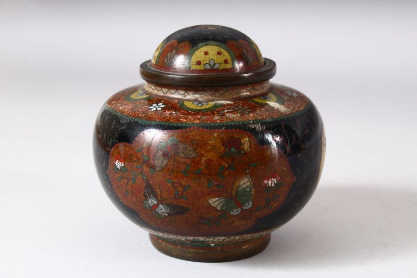 A JAPANESE CLOISONNE KORO AND COVER, the bowl with three panels of flowers, butterflies and stylised birds, 11cm high.