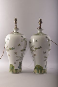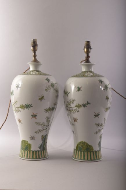 A GOOD PAIR OF CHINESE FAMILLE VERTE PORCELAIN VASE LAMPS, undrilled, painted with birds amongst blossom, mark to each base, each approx. 52cm high.