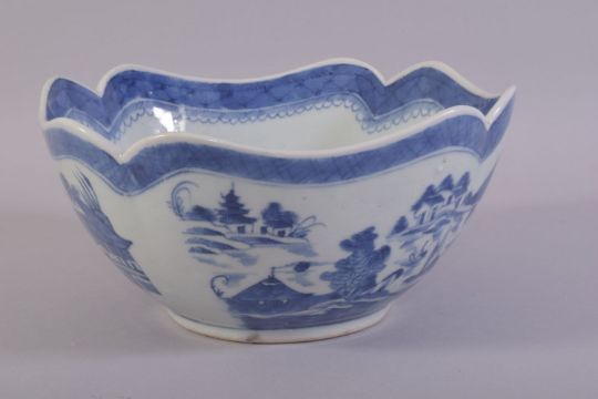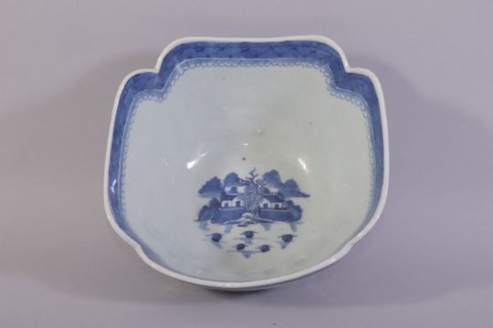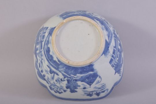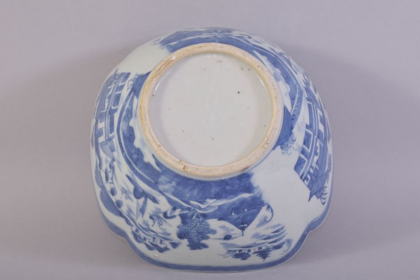 A CHINESE BLUE AND WHITE PORCELAIN BOWL, decorated with a landscape including buildings, boats and trees, 25cm diameter.