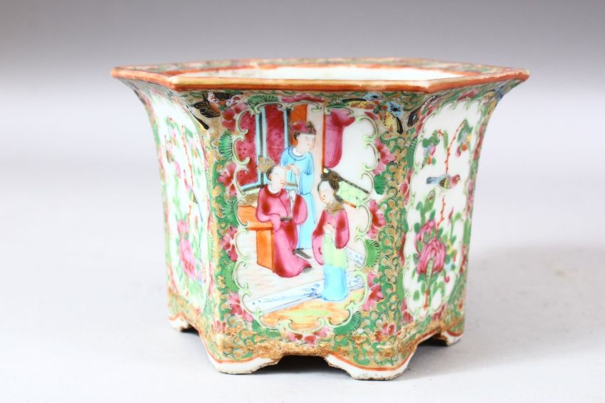 A SMALL CHINESE CANTON PORCALAIN JARDINIERE, painted with panels of figures, birds, butterflies and flowers, 11cm high, 14.5cm diameter.