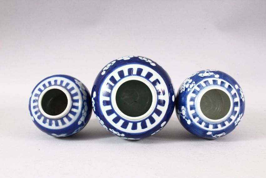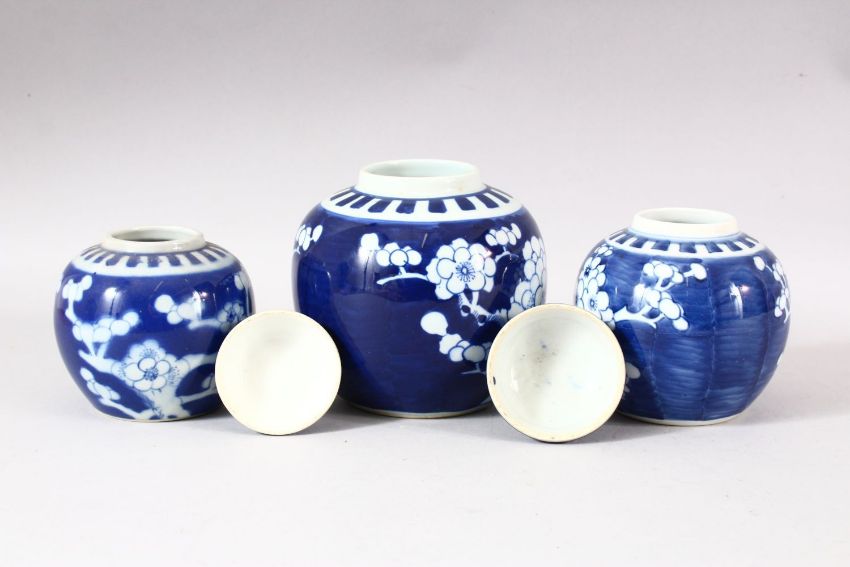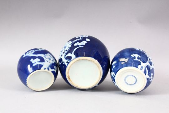 A LOT OF THREE CHINESE BLUE & WHITE PORCELAIN PRUNUS GINGER JARS, one with a cover