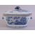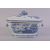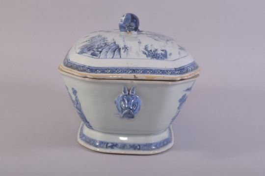 A CHINESE BLUE AND WHITE PORCELAIN TUREEN AND COVER, decorated with landscape scenes including buildings, boats, trees and figures, with zoomorphic handles, the cover handle formed as a fruit, 33cm long, overall 21cm high.