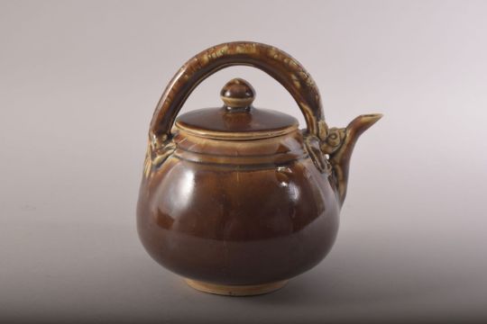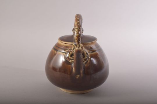 A SMALL CHINESE TREACLE GLAZE TEAPOT, with a chilong type handle, 13.5cm high.