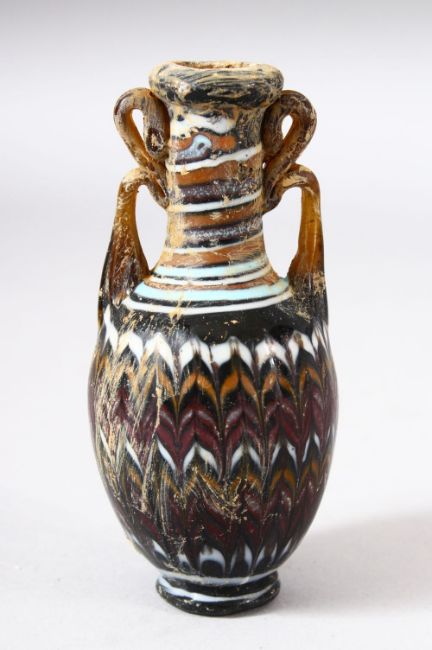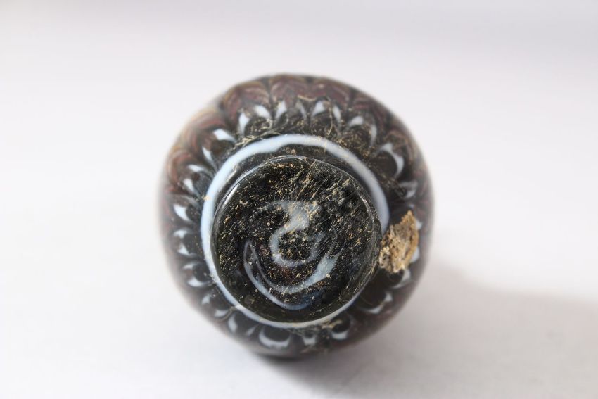 A MARVERED GLASS VESSEL / VASE, possibly Roman, 11cm high.