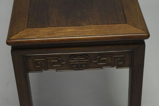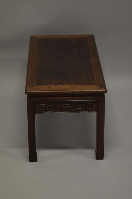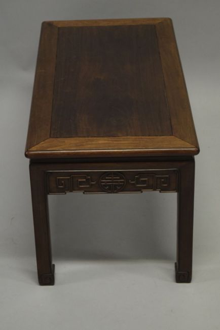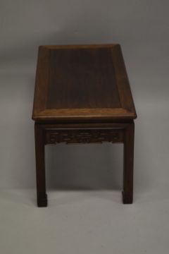 A CHINESE HARDWOOD RECTANGULAR TABLE, with carved frieze and supported on four scroll feet, 47cm high, 78.5cm long, 43cm deep.