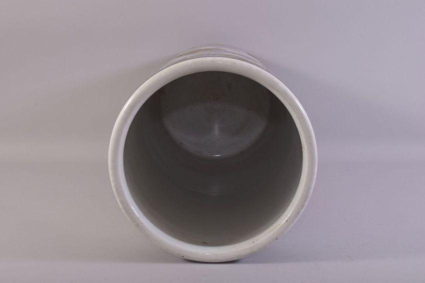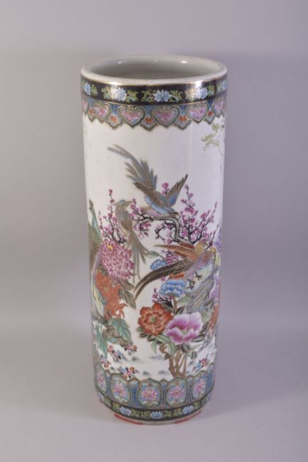 A CHINESE FAMILLE ROSE PORCELAIN WALKING STICK STAND, vividly decorated with peacocks amongst native flora with gilt highlights, 62cm high.