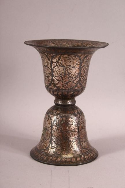 A SMALL SILVER INLAID BIDRI SPITTOON, 15cm high, 11cm diameter.
