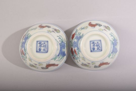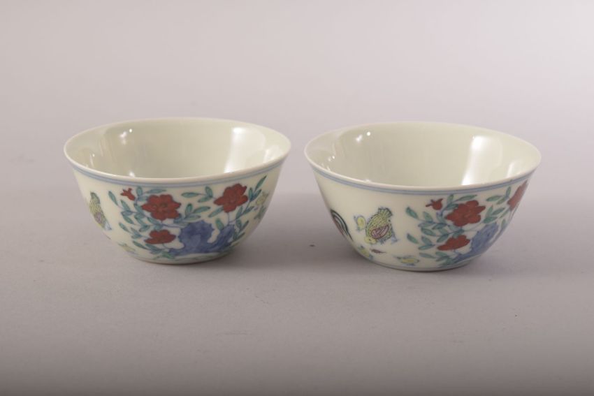 TWO GOOD CHINESE PORCELAIN ROOSTER CUPS, painted with roosters, chicks and flora, both with six character mark to base, both 8cm diameter.