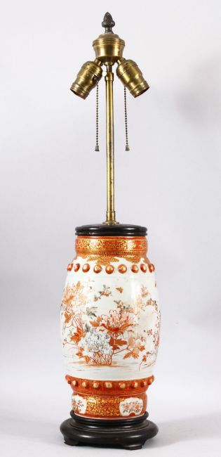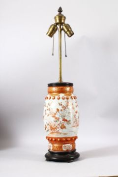 A JAPANESE MEIJI PERIOD KUTANI PORCELAIN VASE / LAMP - decorated with native flora and birds with raised stud bosses, mounted for lamp ( not tested ), 71cm high
