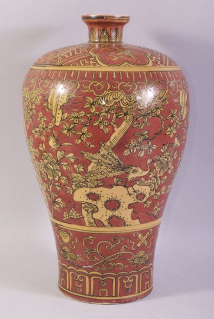 AN UNUSUAL CHINESE RED GROUND MEIPING VASE, painted with peacocks and other birds surrounded by native flora, six character mark to base, 41cm high.