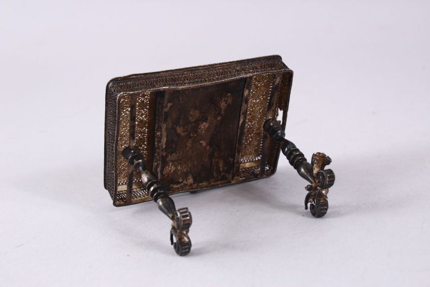 A FINE ISLAMIC SILVER FILIGREE MINIATURE TABLE, with a drawer, 5.5 x 6.5