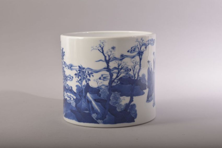 A GOOD CHINESE BLUE AND WHITE PORCELAIN BRUSH POT, decorated with scenes of figures in an outdoor setting, 16.5cm high.