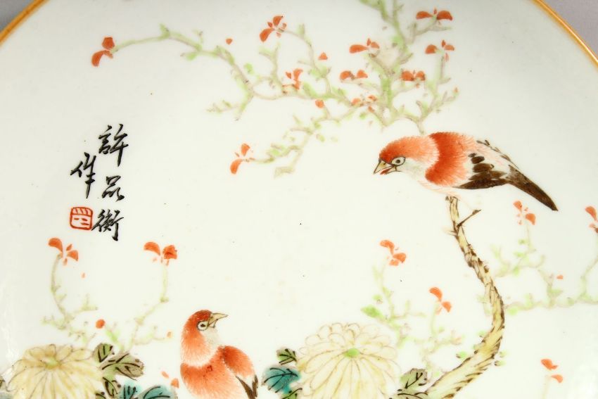 A VERY GOOD PAIR OF REPUBLIC CIRCULAR DISHES, painted with birds, chrysanthemums and calligraphy, 22cm diameter.