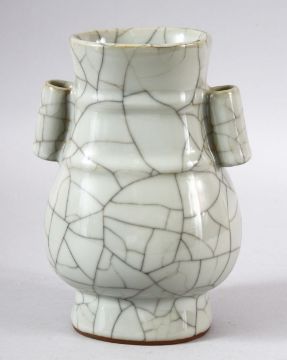 A CHINESE GE STYLE TWIN HANDLE CRACKLE GLAZE VASE, 18.5cm high.