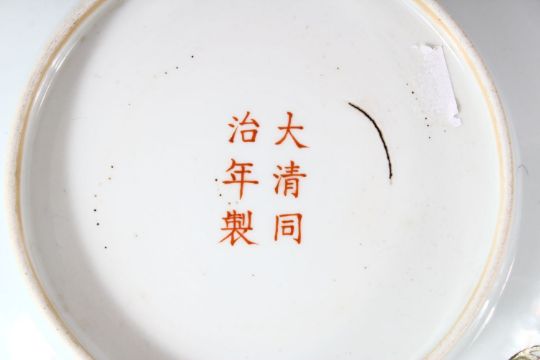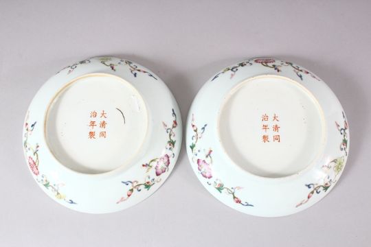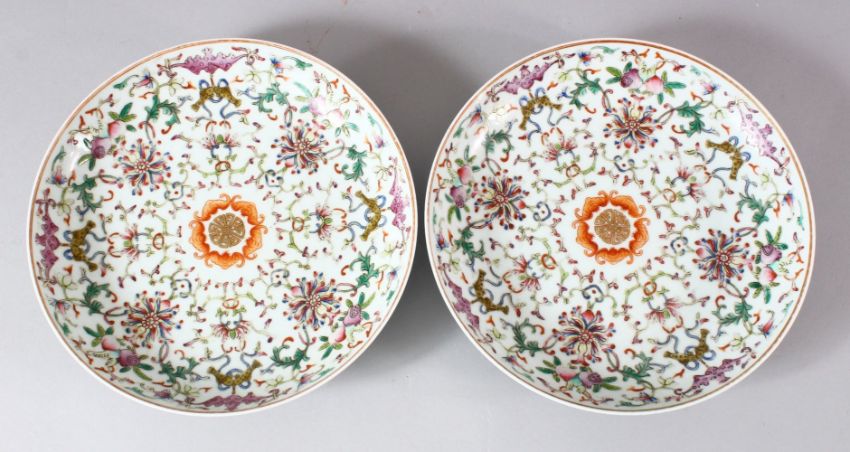 A PAIR OF CHINESE FAMILLE ROSE PORCELAIN DISHES, painted with bats, fish, peaches and flora, six character mark to base, 20.5cm diameter.