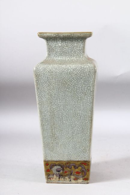 A CHINESE SQUARE FORM CRACKLE GLAZE VASE, painted with a stylised chrysanthemum and butterflies, 31.5cm high.