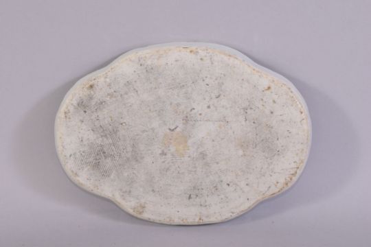 A CHINESE BLUE AND WHITE PORCELAIN DISH, the centre painted with a mountainous landscape with buildings and a boat, 19cm x 13.5cm.