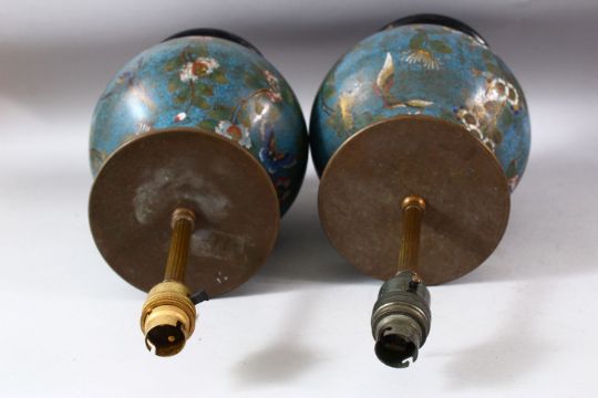 A PAIR OF CHINESE BLUE GROUND CLOISONNE VASES / LAMPS, decorated with native flora, butterflies and birds upon a geometric pattern, both approx. 44cm high.