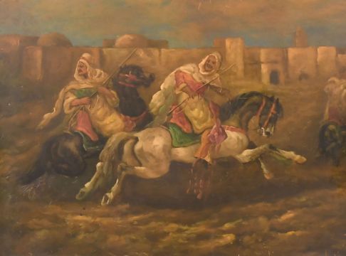 A PAIR OF 20TH CENTURY OIL ON PANEL SCENES OF EASTERN HORSEMAN BRANDISHING WEAPONS, each 12" x 16", in fine quality geometric inlaid frames.