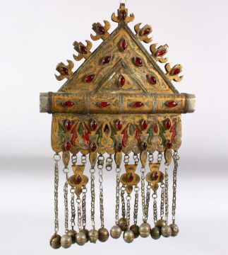 AN ISLAMIC CEREMONIAL NECKLACE with large metal pendant, the pendant 22cm x 21.5cm.