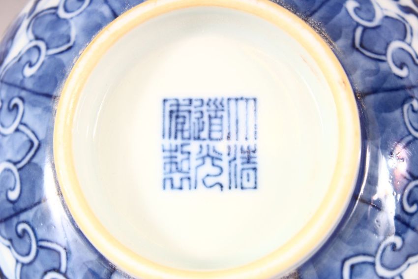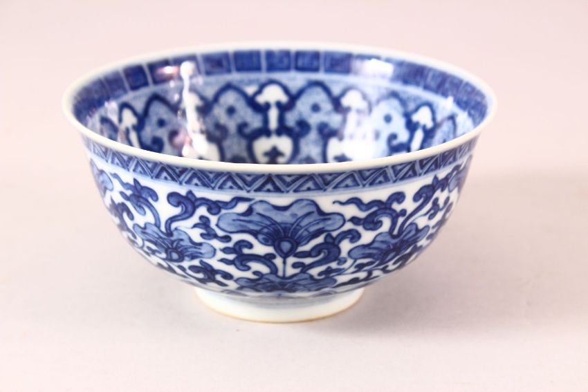 A CHINESE BLUE AND WHITE PORCELAIN BOWL, decorated with scenes of lotus, six character mark to base, 13.5cm diameter.