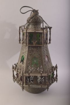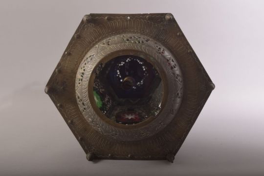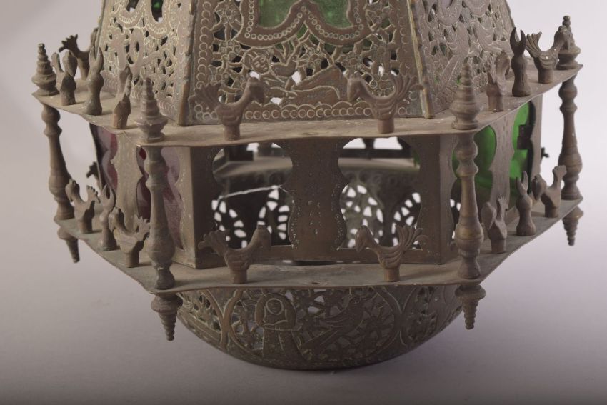 A PERSIAN QAJAR BRASS OPENWORK HANGING LANTERN, with stained glass star windows and bird shaped finials, on chain with brass fitting, lantern 45cm.