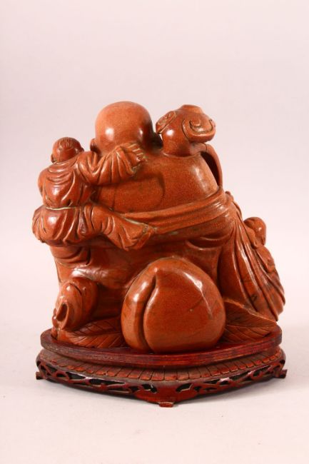 A SUPERB CHINESE HARD STONE CARVING OF BUDDHA holding a scepter seated upon a cloud, on a wooden base, 28cm high.