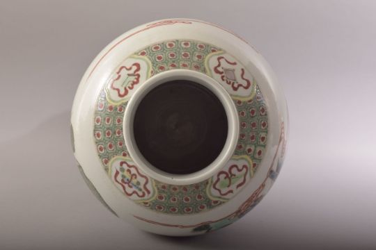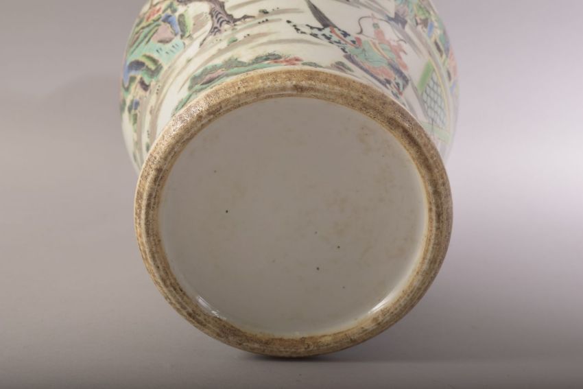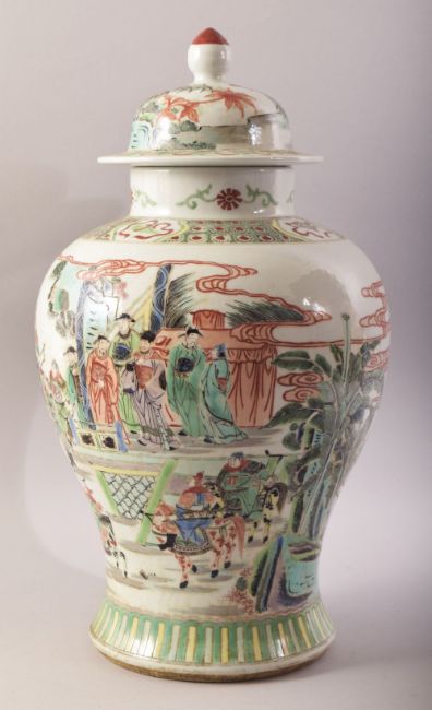A CHINESE FAMILLE VERTE PORCELAIN VASE AND COVER, painted with scenes of warriors and other figures in a landscape setting, 43cm high overall.