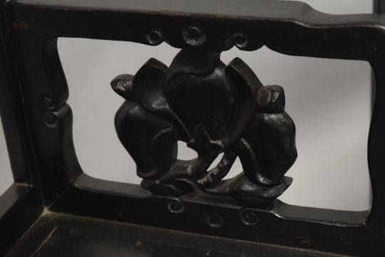 A GOOD PAIR OF CHINESE CARVED HARDWOOD CHAIRS, inlaid with mother of pearl, with well carved bat splats, the apron and legs inlaid with mother of pearl, 96cm high, 61cm wide, 48cm deep.