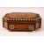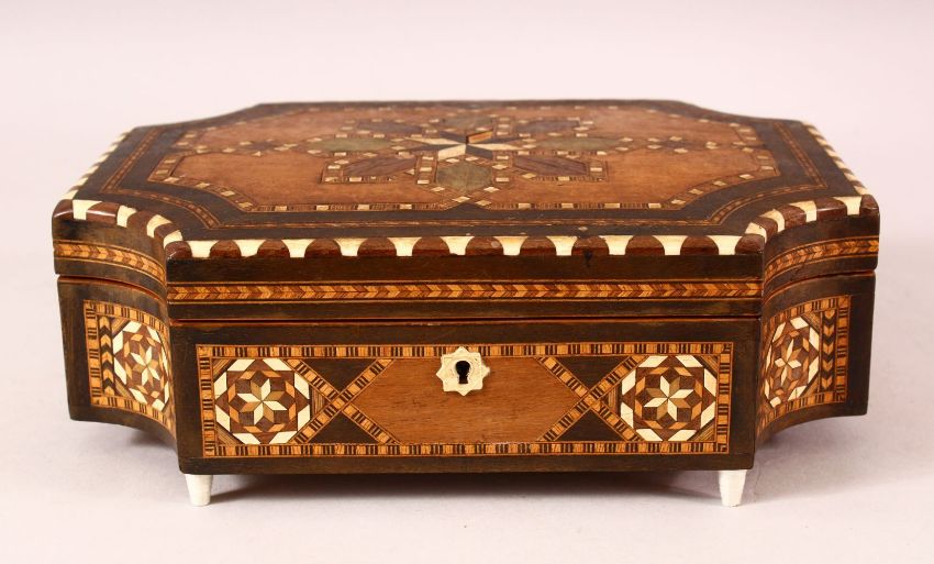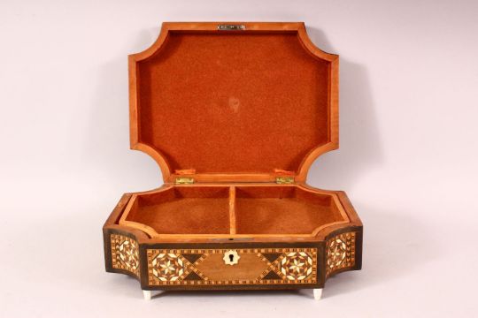 A HISANO MORESQUE INLAID WOODEN MUSIC BOX - with exotic wood inlays and bone or ivory - 26cm x 20cm.