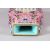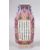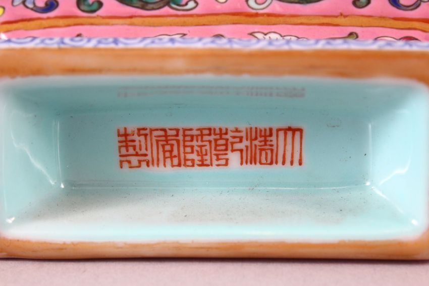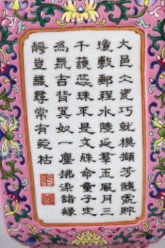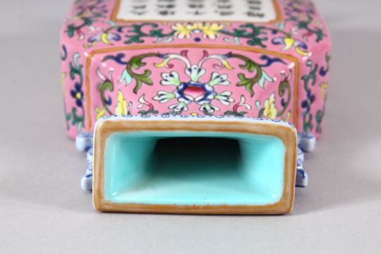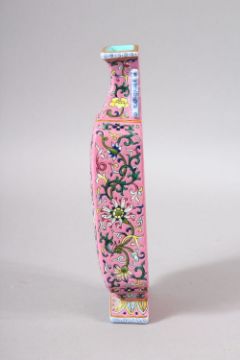 A GOOD CHINESE FAMILLE ROSE PORCELAIN WALL POCKET VASE, the body decorated with colourful floral sprays surrounding a panel of calligraphic script, the neck with two small zoomorphic handles, the interior with turquoise glaze, mark to base, 22cm high.