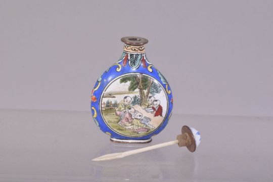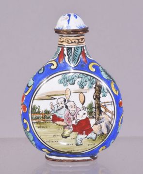 A CHINESE ENAMELLED SNUFF BOTTLE AND STOPPER, each side decorated with a roundel containing boys, 5.5cm.