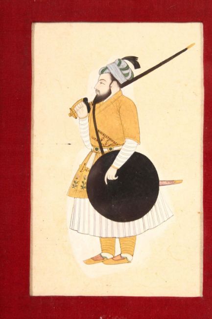 AN INDIAN MINIATURE PAINTING OF A NOBLEMAN - framed measuring 21cm x 16cm.