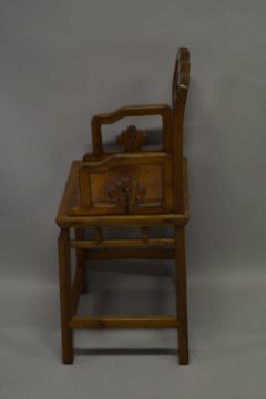 A CHINESE PIERCED AND CARVED WOODEN CHAIR, with shaped top rail and carved back section with a bat above fruit and leaves, supported on four scroll feet, the legs united by stretchers, 91cm high, 53cm wide, 40cm deep.