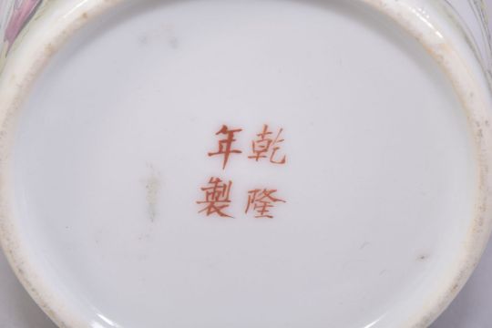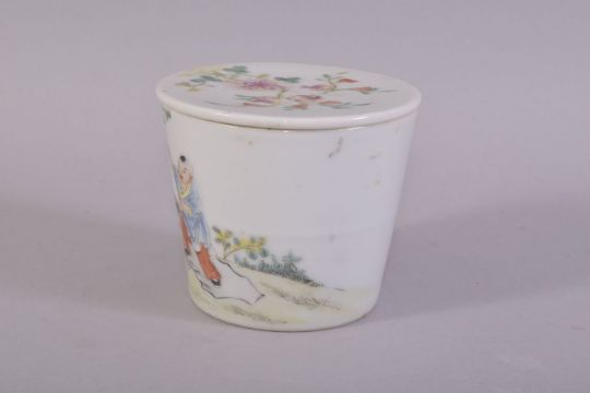 A CHINESE FAMILLE ROSE PORCELAIN BOX AND COVER, painted with two boys at a tree, the lid with floral spray, red four character mark to base, 8cm high, 9.5cm diameter.