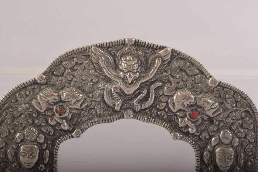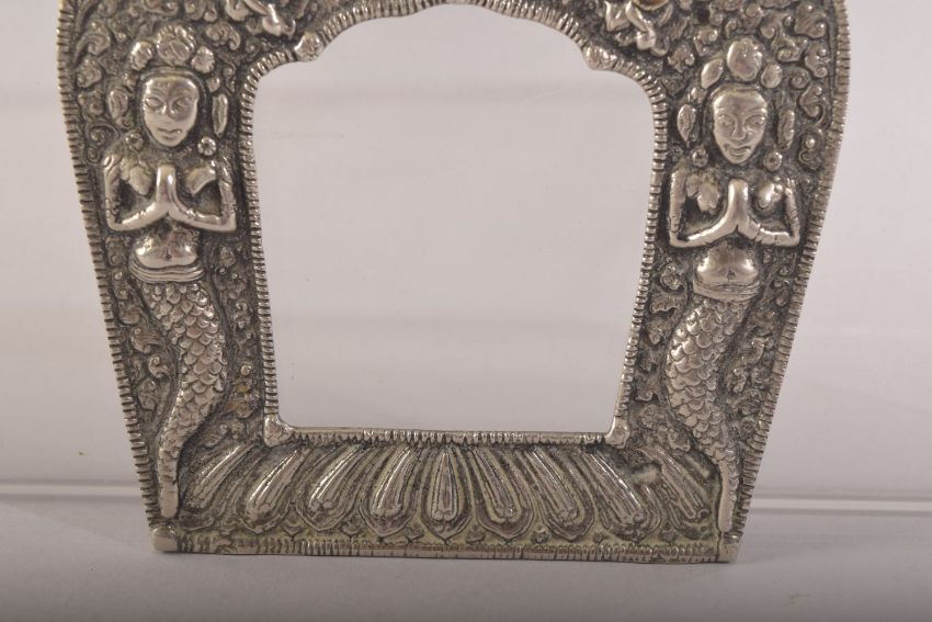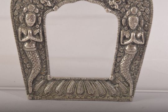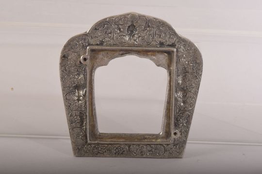 AN INDIAN OR NEPALESE WHITE METAL FRAME, 11.5cm x 11cm.