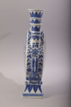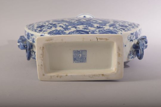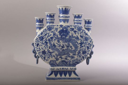 A CHINESE BLUE AND WHITE FLOWER VASE, with multi spouts / openings, the vase painted with a dragon to each side, with porcelain drop rings, six character mark to base, 30.5cm high.