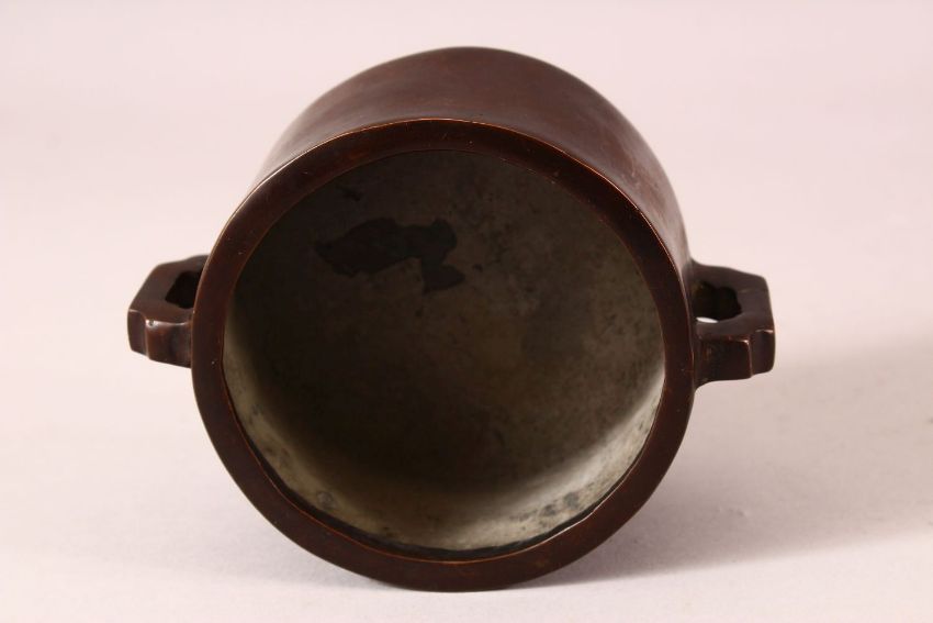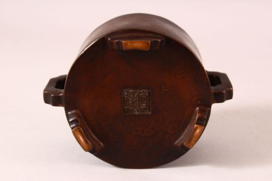A CHINESE BRONZE TWIN HANDLED CENSER, on three feet with an impressed seal mark to base, 14cm diameter.