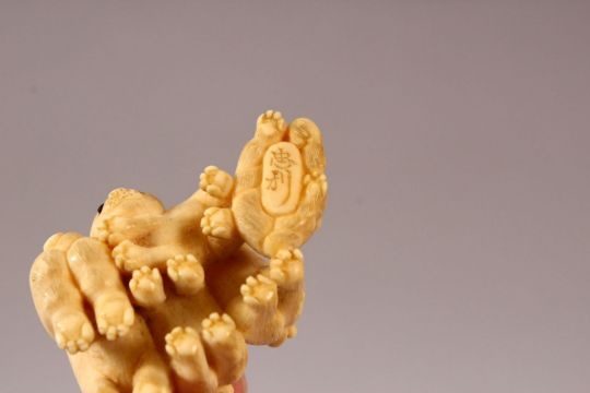 A JAPANESE MEIJI PERIOD CARVED IVORY NETSUKE OF A BOAR AND DOGS - the boar / pig seated aside four puppy dogs, the underside signed " Tadatoshi" 3.9cm