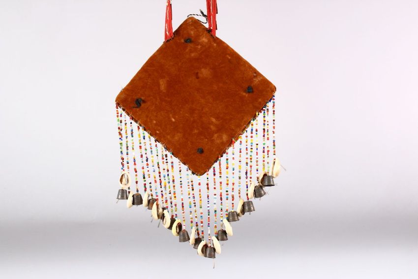 AN ISLAMIC CEREMONIAL NECKLACE, the plaque with cowrie shell border, 15.5cm square.
