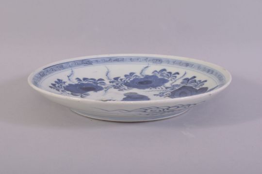 A CHINESE BLUE AND WHITE PORCELAIN DISH, painted with rooster and native flora, 27cm diameter.