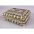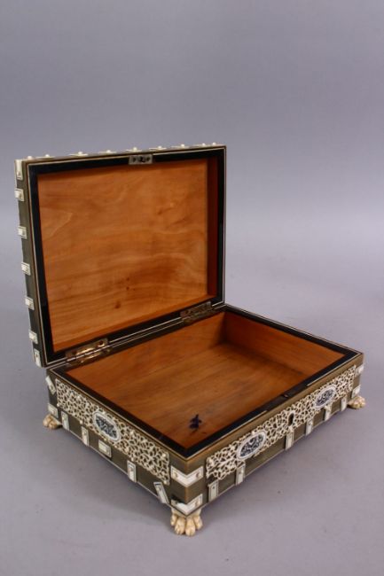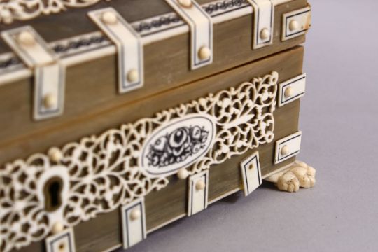 A 19TH CENTURY ANGLO INDIAN HORN & IVORY BOX, with carved ivory openwork on horn, with incised and stained decoration of elephants and deity, on four carved ivory feet, 21cm wide x 15cm deep.