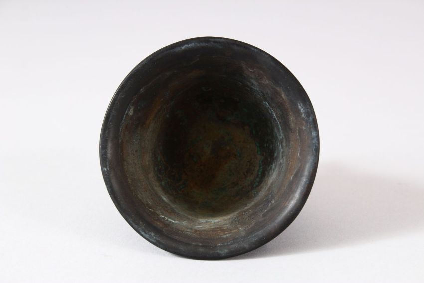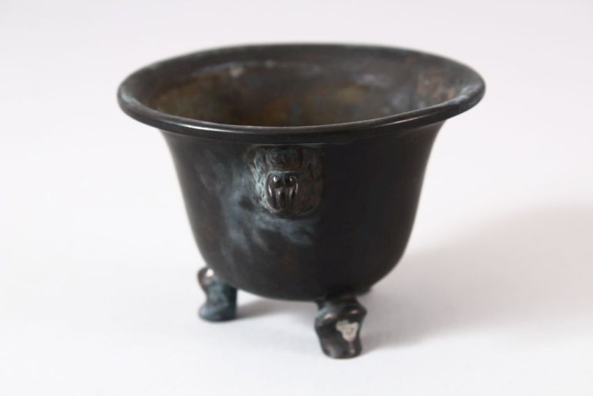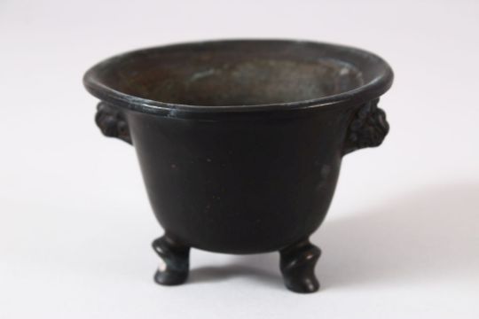 A CHINESE TWIN HANDLE BRONZE INCENSE BURNER / CENSER, with tripod feet and twin lion dog mask handles, with a six character mark underside, 9cm