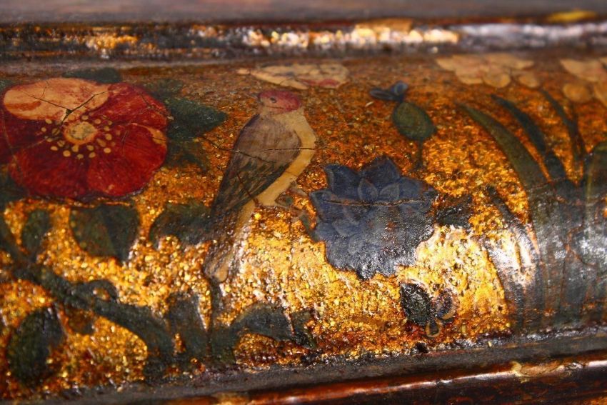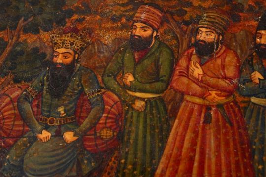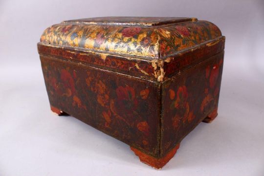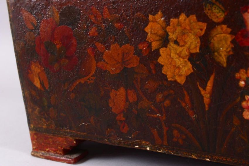A GOOD PERSIAN QAJAR LACQUER PAINTED LIDDED BOX, decorated to the exterior with birds and detailed sprays of native flora, the lid decorated with gold spray and flora with a central painting depicting figures with gifts to a noble figure, the underside of the lid again finely painted with a panel depicting noblemen upon horseback attacking tigers, 28cm x 42cm x 28cm deep.