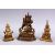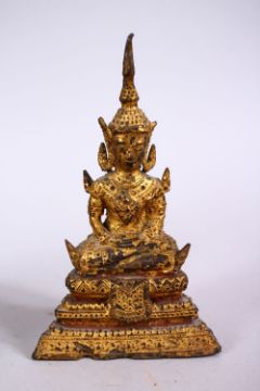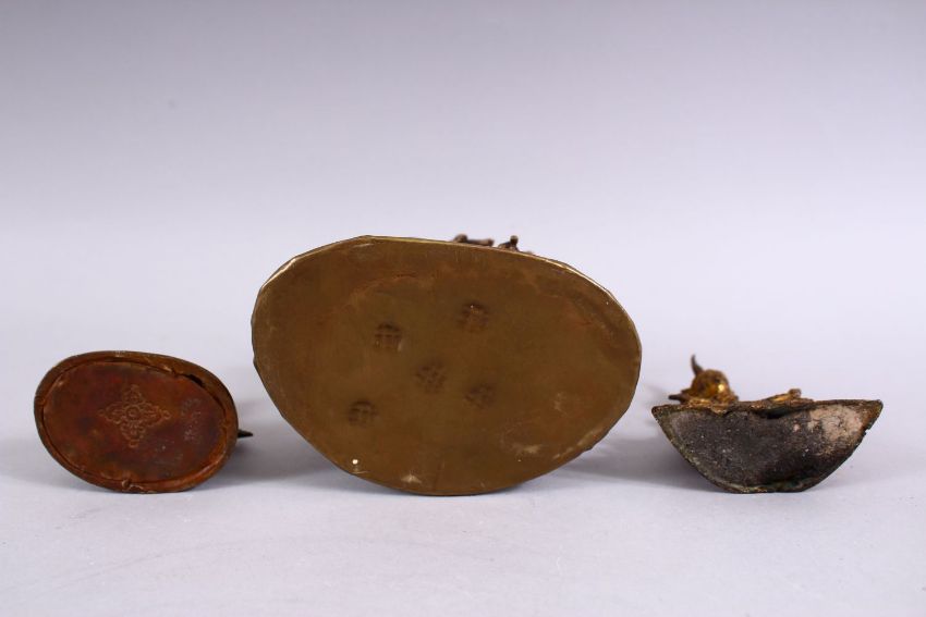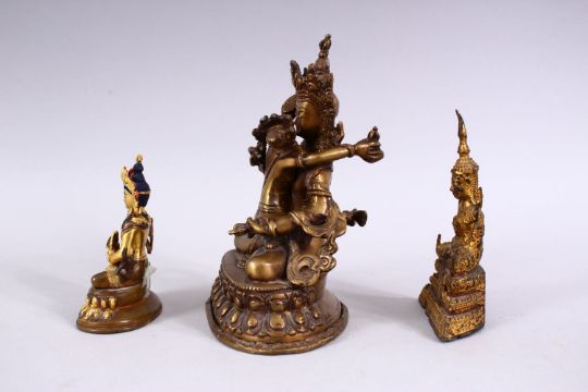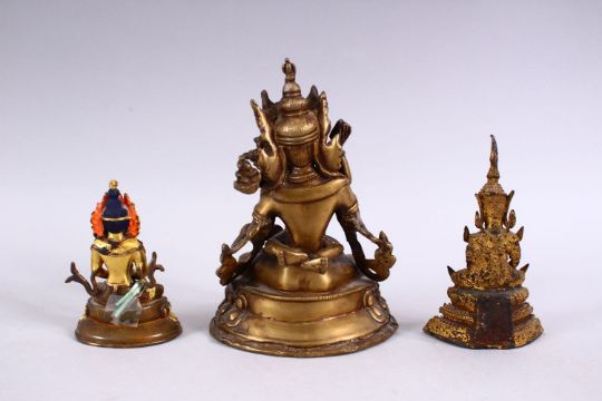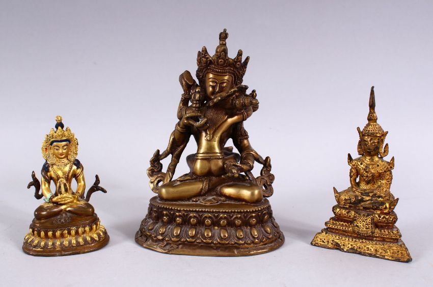 THREE TIBETAN GILT BRONZE FIGURES, each with varying pose, the smallest with poly chrome decoration, impressed mark to base, 10cm, one gilt bronze with legs and arms crossed, possibly 18th century, 13cm, and one larger gilt bronze erotic bronze figure, 17cm. (3)