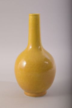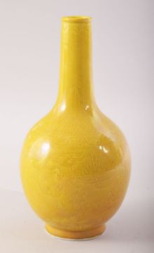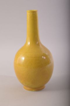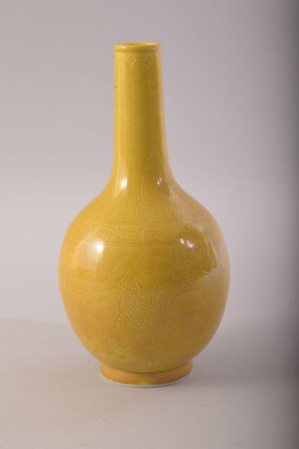 A SMALL CHINESE YELLOW GLAZE PORCELAIN BOTTLE VASE, incised under glaze with dragons and the flaming pearl of wisdom, mark to base, 17.5cm high.