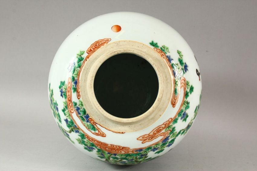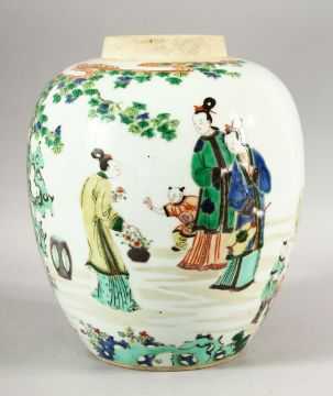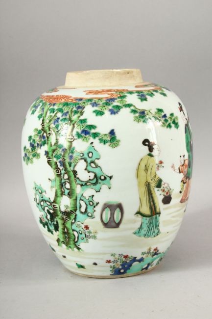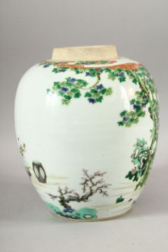 A CHINESE FAMILLE VERTE GINGER JAR, painted with figures and flowering trees, 26cm high.