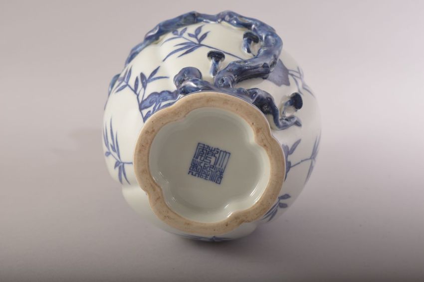 A CHINESE BLUE AND WHITE PORCELAIN VASE, with moulded relief peach tree decoration, the body with bats, mark to base, 31cm high.